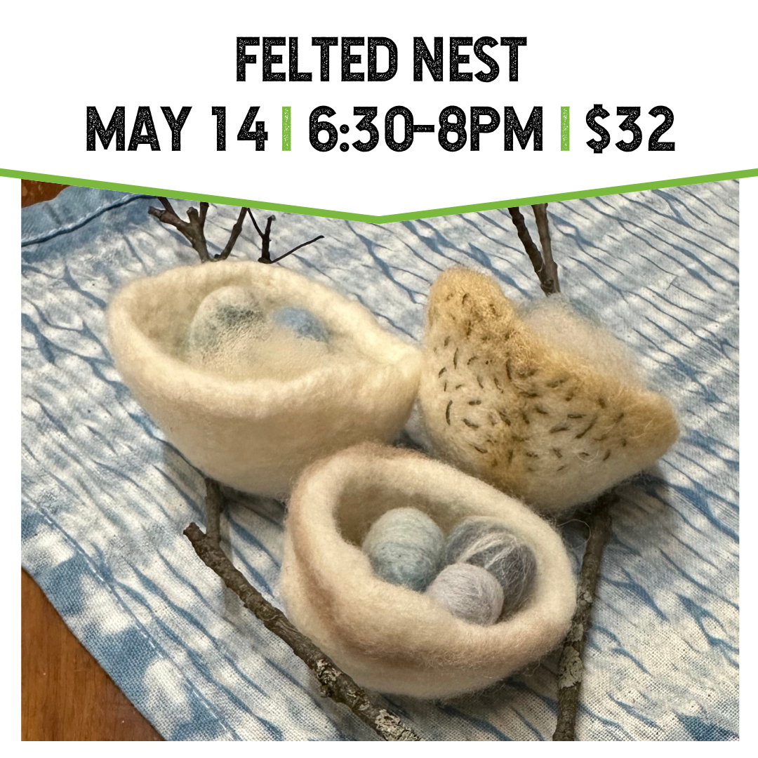 Combine wet and needle felting with some spring colors and create a magical nest and some tiny eggs. EmbelLish with a few simple embroidery stitches if you choose. Class utilizes very sharp needles, suitable for beginners.