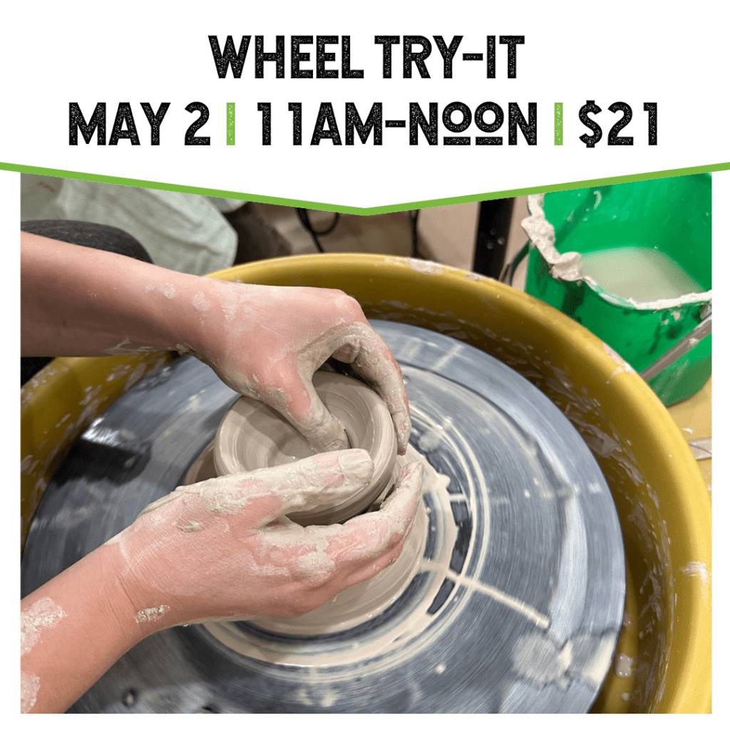 Curious about the pottery wheel? Wheel Try-It is a quick introduction to throwing clay. With guidance from an instructor, you’ll learn the basics of centering clay and shaping a small piece. Perfect for beginners who want to experience the wheel for the first time.