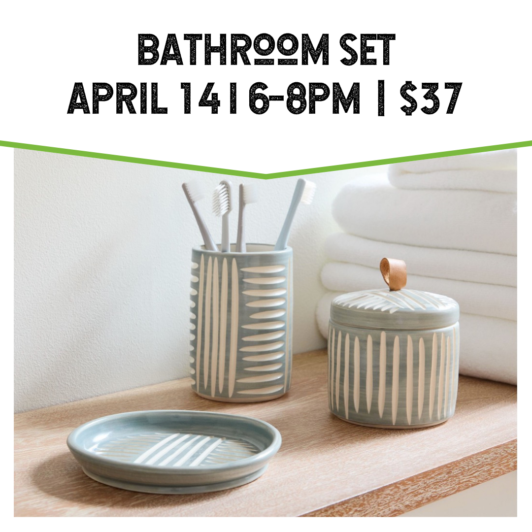 Design a coordinated ceramic bathroom set using hand-building techniques. Students will create pieces such as a soap dish, toothbrush holder, or lidded container, then glaze them to match. Functional, stylish, and satisfying to use at home. BOOK YOUR SEAT!